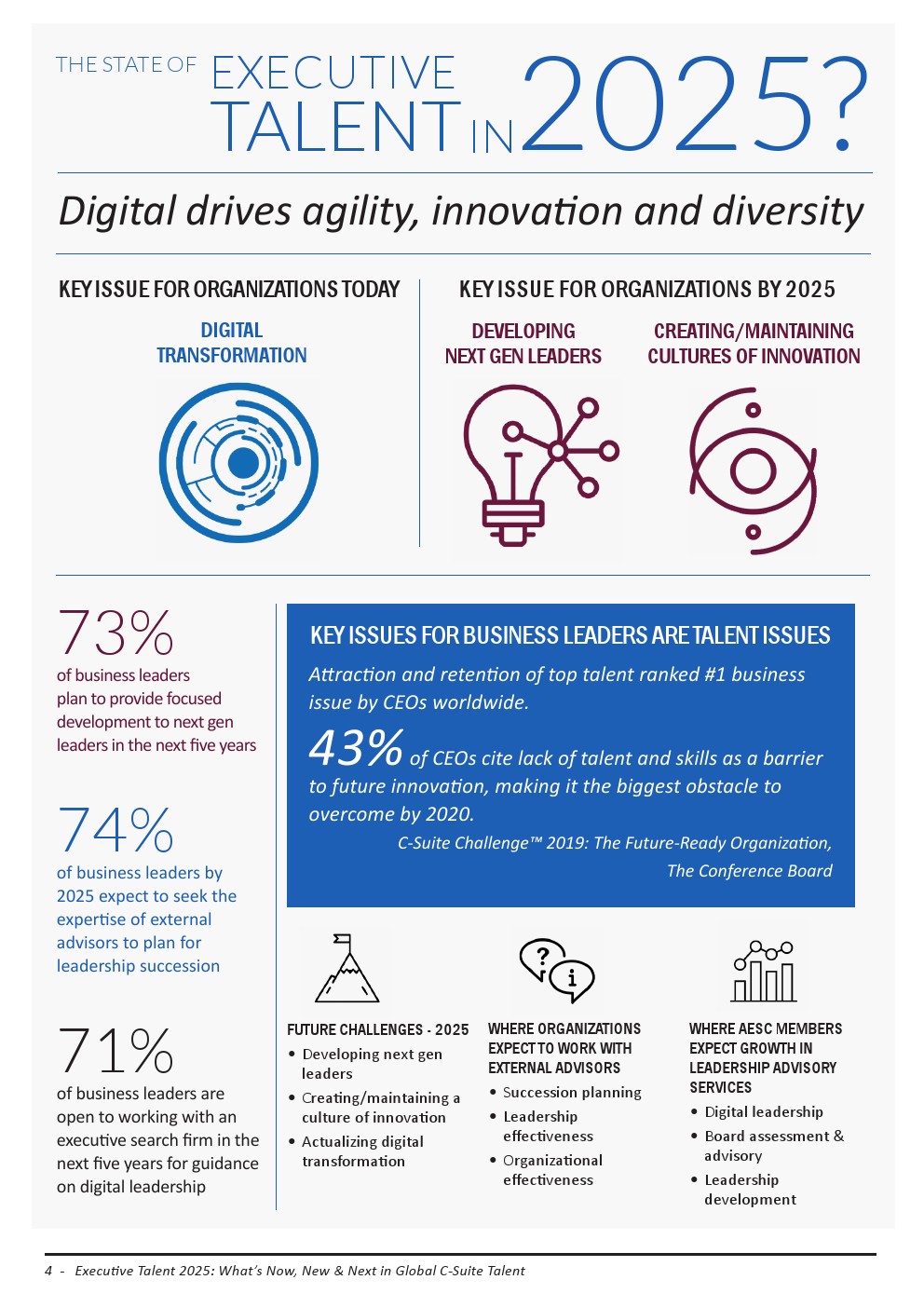 AESC今年的调查结果表明,数字化转型是全球企业的首要议程。数字化正在推动对敏捷领导者和敏捷企业的需求,推动了对C-Suite和董事会层面多样性的迫切需求。