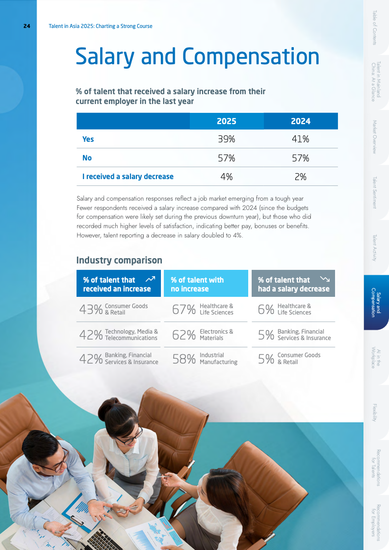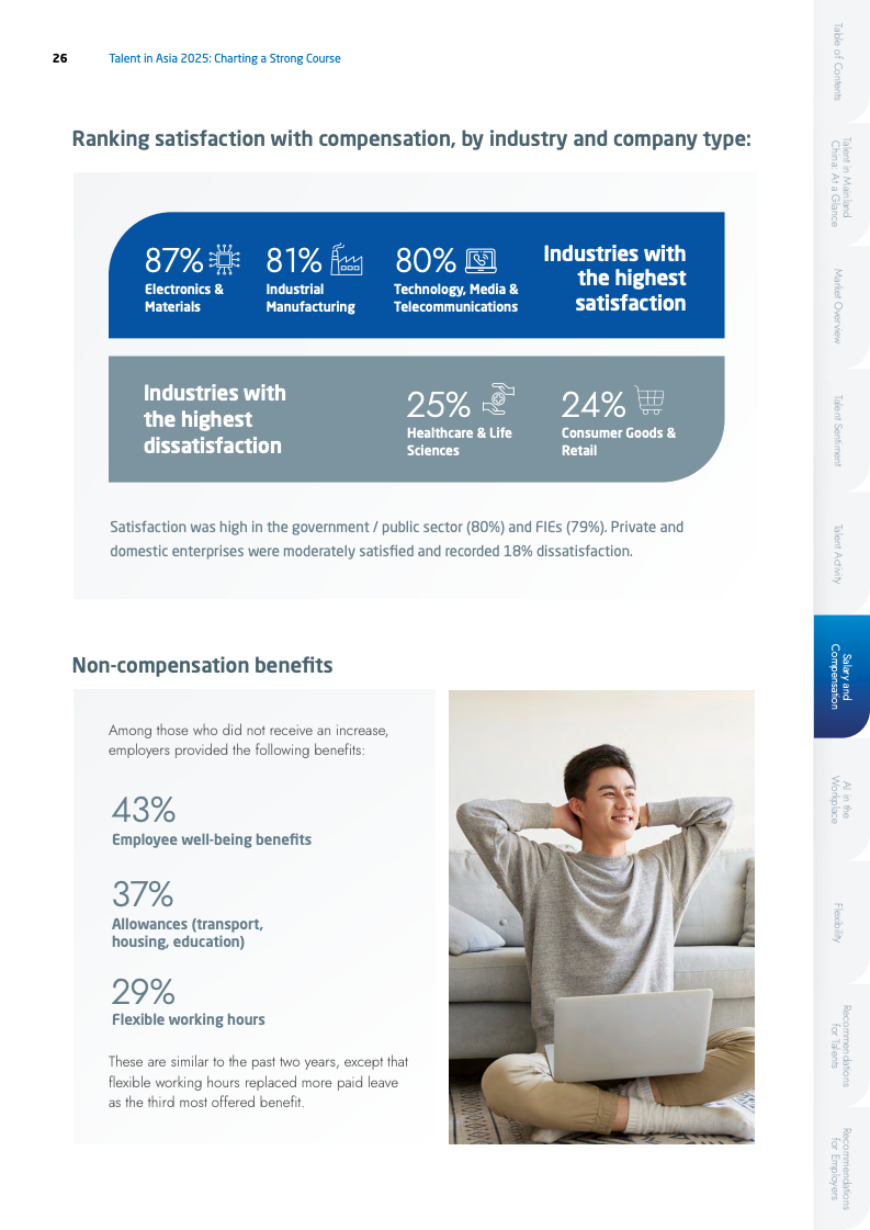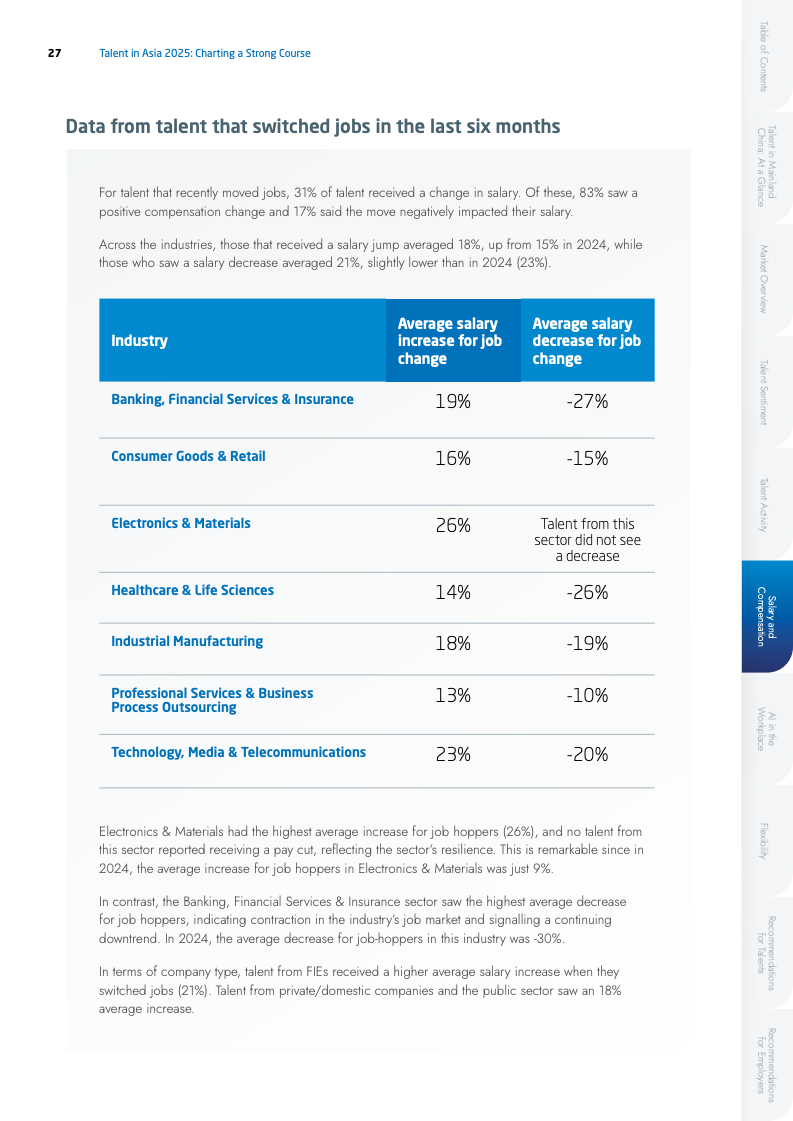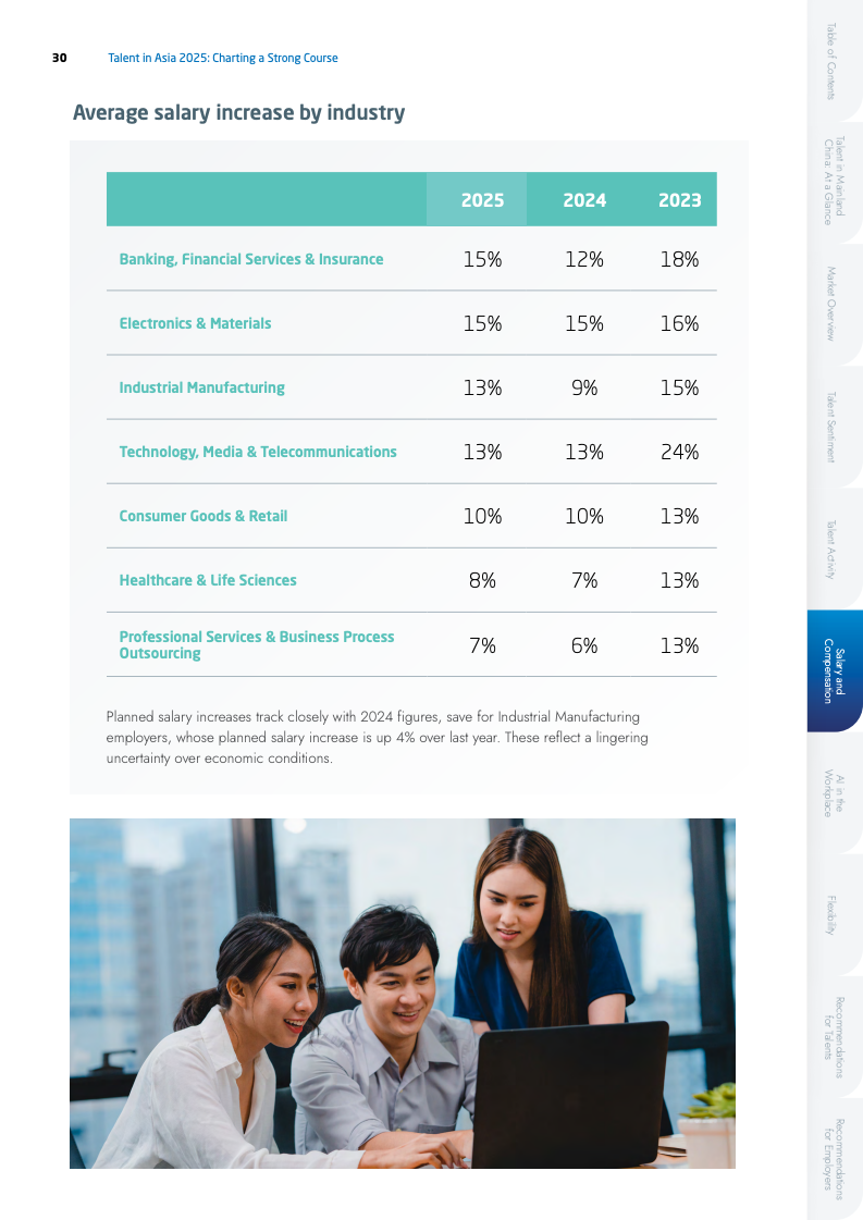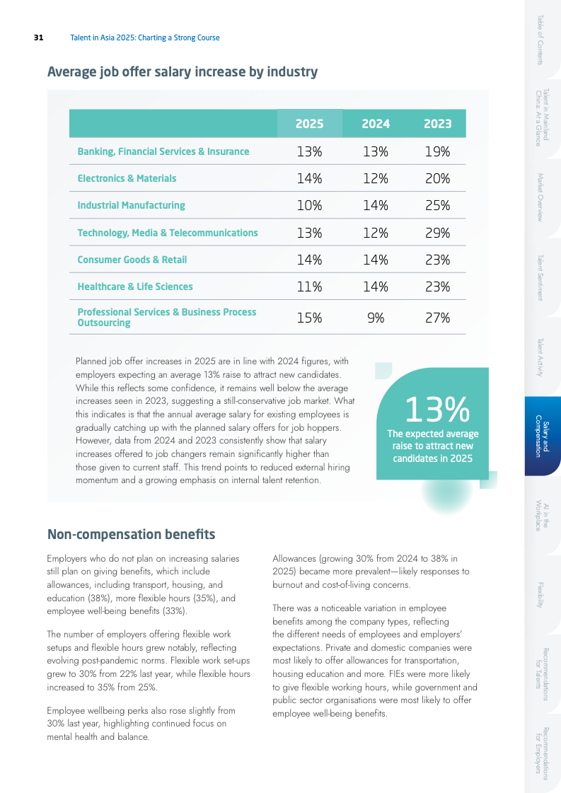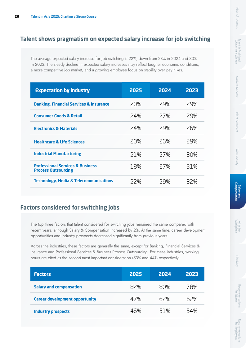 薪酬市场呈现出增长放缓但满意度提升的矛盾现象。2025年平均加薪幅度由17%降至13%,但薪酬满意度却逆势上升至77%。这反映出在不确定的经济环境下,人才的薪酬期望趋于理性。行业间薪资增幅差异拉大,电子行业以15%领跑,而专业服务业仅为7%。