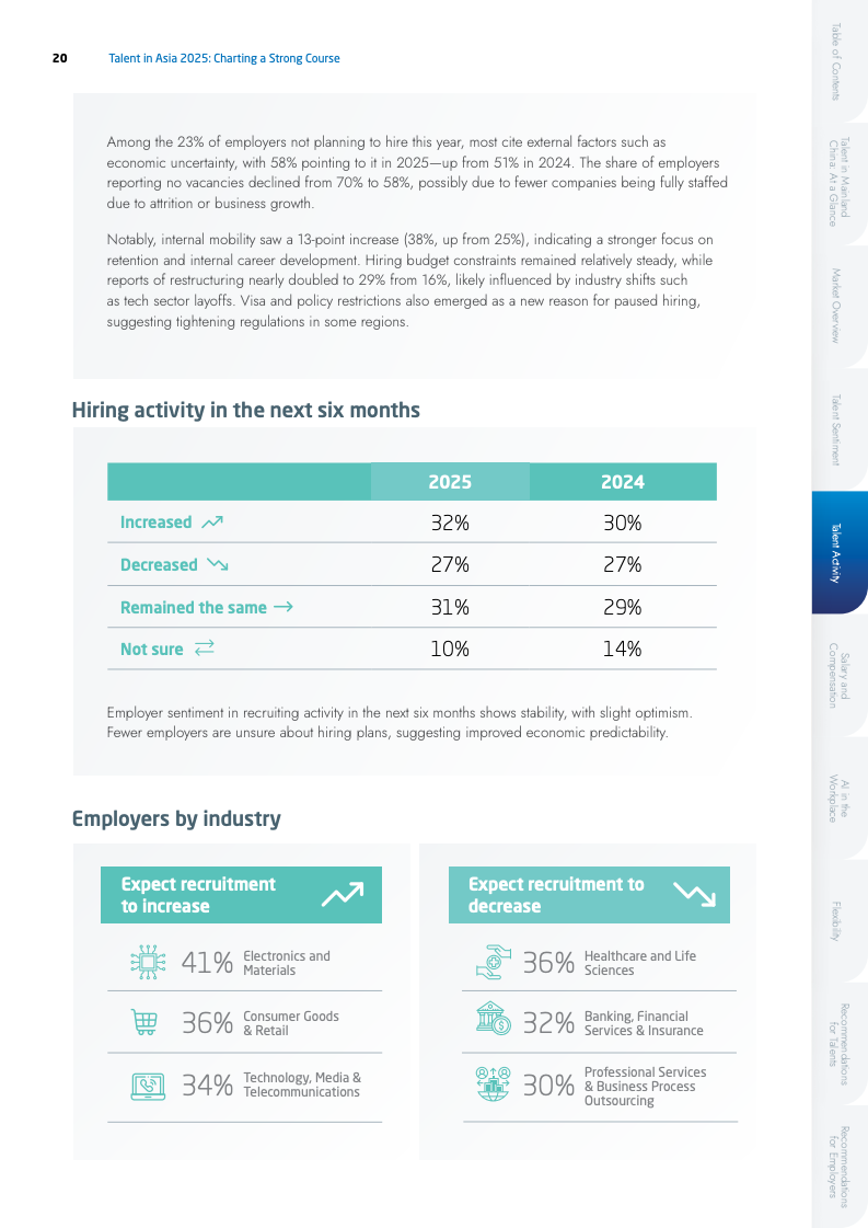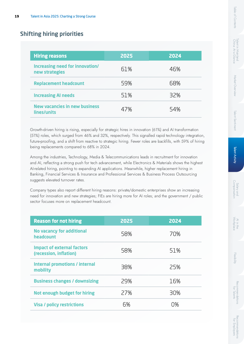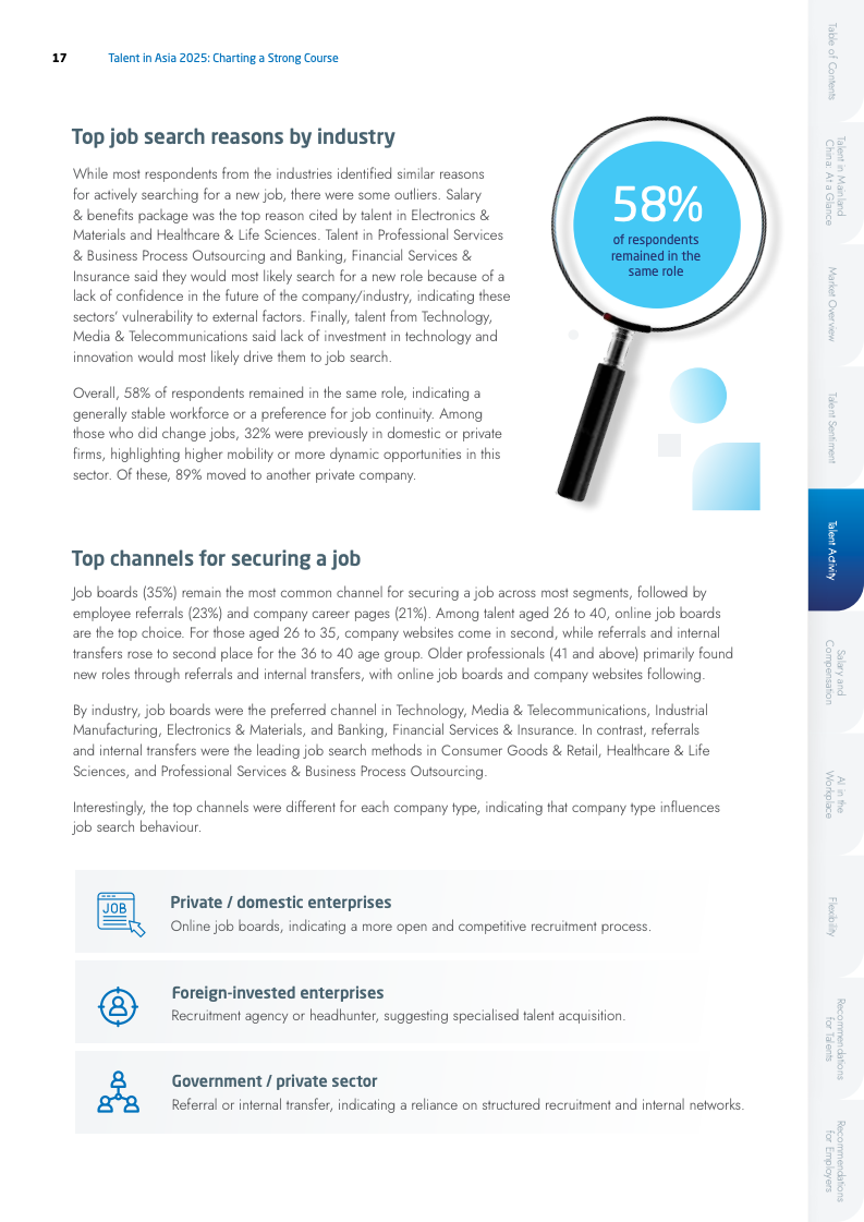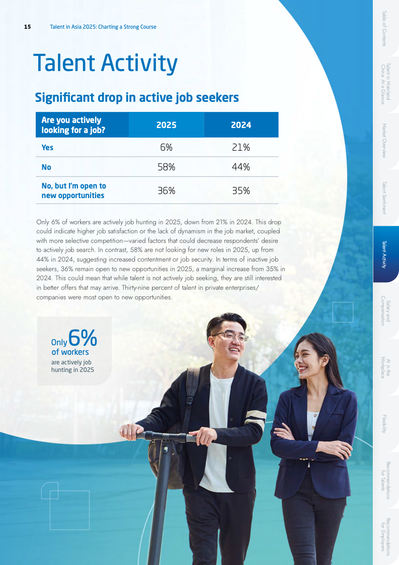 人才流动性显著降低,凸显出市场避险情绪的升温。主动求职者比例从2024年的21%骤降至6%,而58%的在职人员明确表示倾向于留任,该比例高于2024年的44%。在跳槽动机方面,职业发展(50%)已取代薪酬(43%),成为驱动人才流动的首要因素。