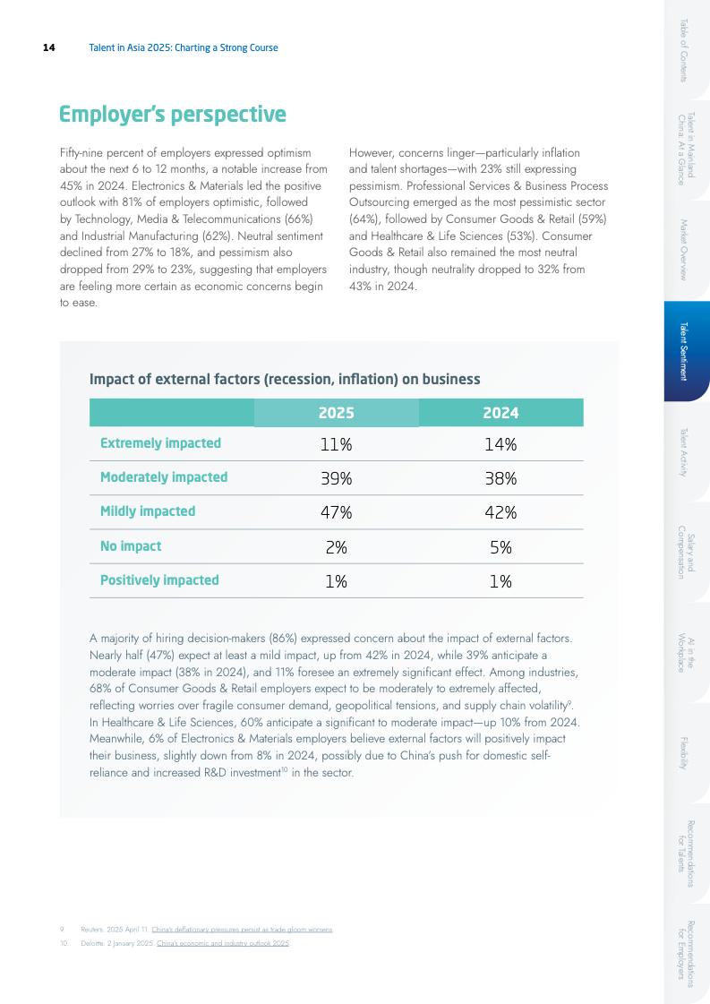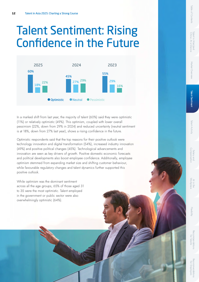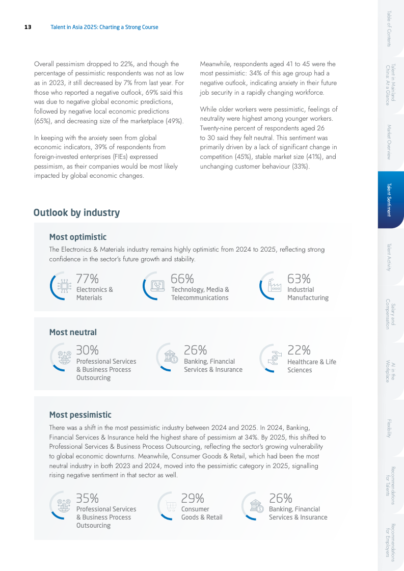2025年中国大陆人才市场呈现谨慎乐观态势,60%的受访者对职业前景表示乐观,尤其在电子与材料(77%)及科技行业(66%)信心更足。然而市场分化显著,人工智能、电动汽车等新兴领域占据超过75%的新增招聘需求,传统行业则面临人才冗余与岗位缩减的双重压力。
